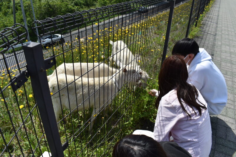 最初、なかなか近づいて来てくれなかったですが、しばらくすると寄ってきて手から草を食べてくれました。
